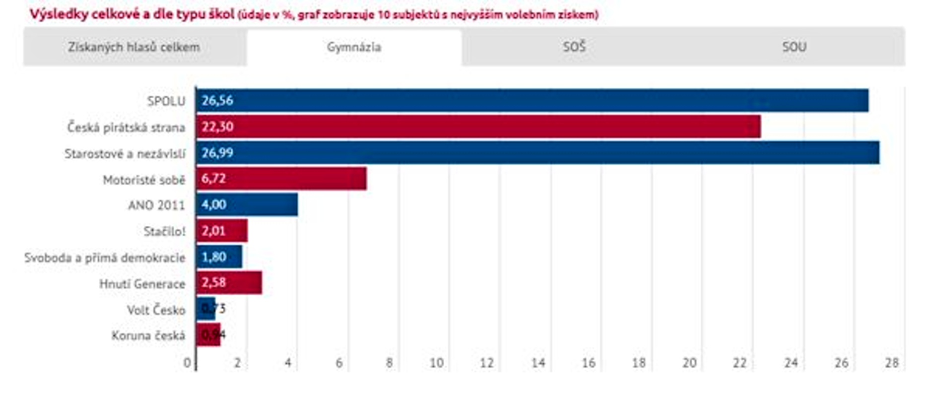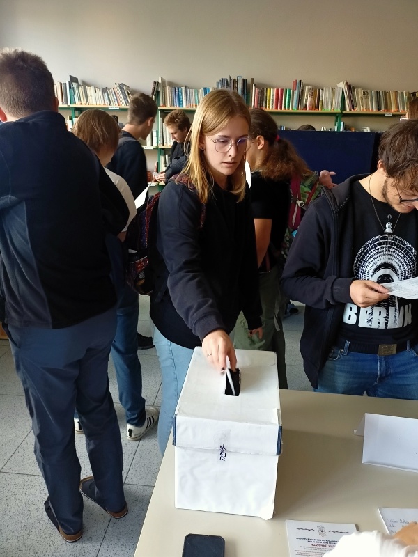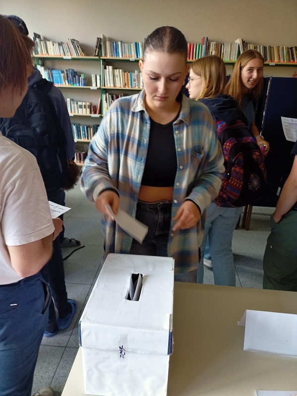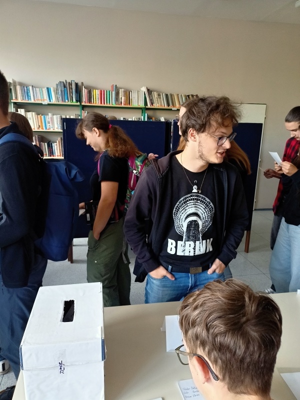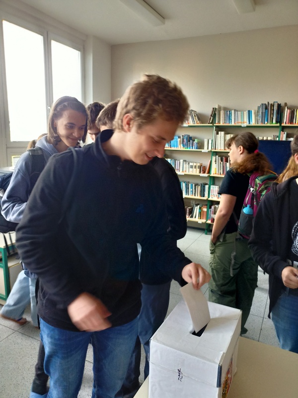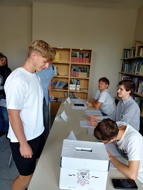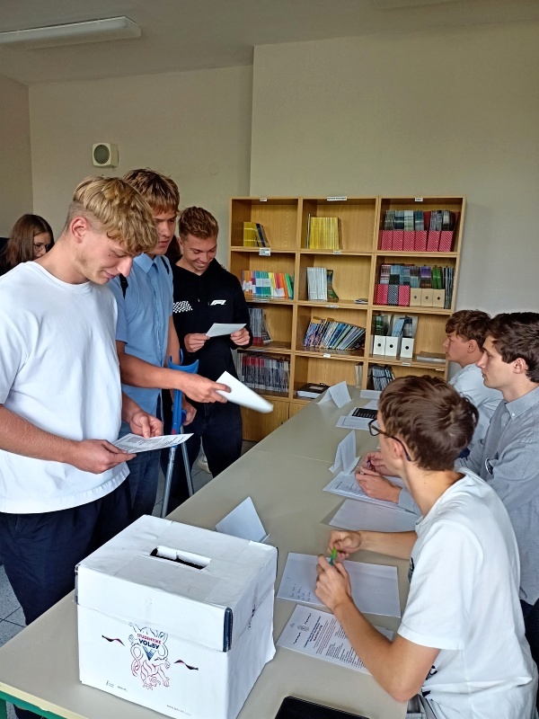 Ani mělničtí gymnazisté nezůstali mimo. K volební urně ve studovně dorazilo ve středu 17. září 2025 125 studentů ze 130 přihlášených. Do počtu možných voličů zasáhla týdenní exkurze do Francie, která jejich počet o několik snížila. Bylo odevzdáno celkem 121 platných hlasovacích lístků. Výsledky se pak příliš nelišily od těch celorepublikových. V následujícím přehledu jsou uvedeny ty kandidující subjekty, které získaly alespoň jeden hlas. Na 8.–12. místě jsou uvedeny podle pořadí na hlasovacím lístku. Počet získaných hlasů je v závorce.