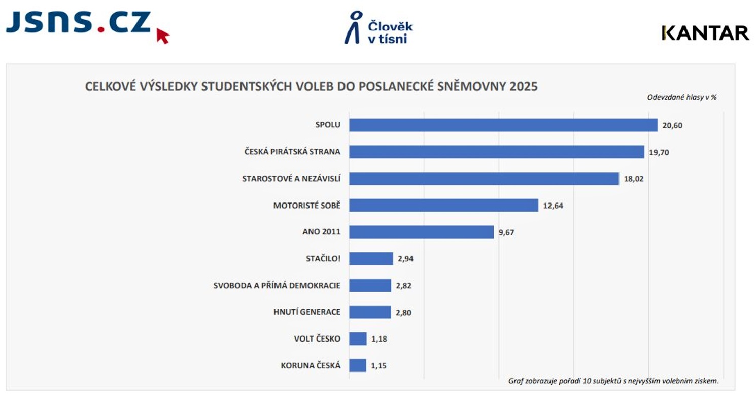 Studentské volby do Poslanecké sněmovny Parlamentu 2025 proběhly v celé ČR ve dnech 17. a 18. září. Studenti vybírali z 26 stran, hnutí a koalic. Výsledky v řádném termínu odevzdalo 637 škol, z toho 271 gymnázií, 285 středních odborných škol (SOŠ) a 81 učilišť (SOU). Bylo odevzdáno 90 820 platných hlasovacích lístků. Tolik celorepubliková statistika. Konkrétní výsledky jsou dostupné na webu jsns.cz.